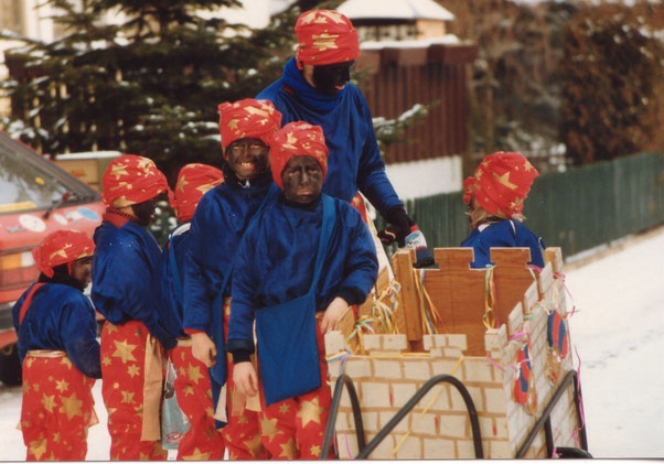1986 hatte Reni eine leuchtende Idee: Wir machen am Fasnachtsumzug mit unseren Kindern mit. Sofort taten sich Reni, Heidi, Moni und Gerti zusammen und überlegten sich kurzerhand ein Motto: der Sarotti-Mohr – mit dem Hintergedanken, die Firma würde uns Streumaterial zur Verfügung stellen. Aber denkste – die waren zu geizig, doch beim Motto blieben wir. So wurde die kleine Fussgruppe Wyber und Goofe geboren!